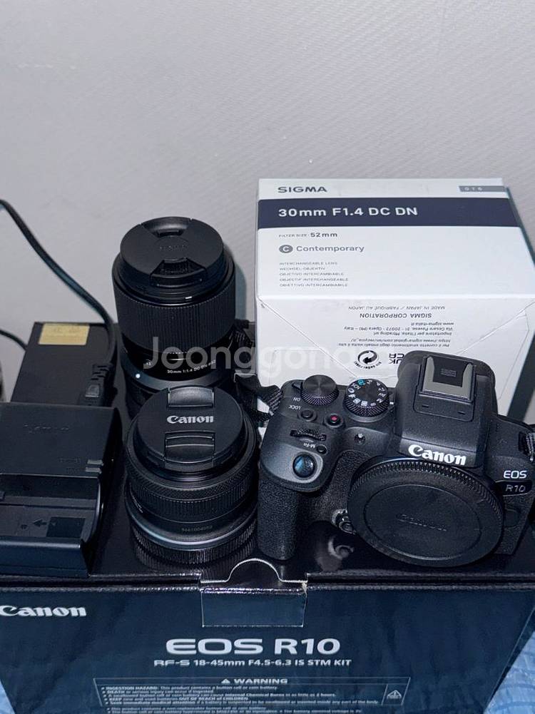 캐논 EOS R10 카메라와 시그마 30mm F1.4 DC DN 렌즈 삼식이 rf-s 18-45 번들 함께 판매합니다 25년 11/13일 제품 구매로 보증기간 2년 남았습니다 시그마 렌즈는 24년 12월 생산 제품입니다 모든 제품 전부 다 사용감 매우 낮습니다 기변으로 인하여 판매합니다 박스, 충전기 ,정품배터리 , 정품스트랩 모든 구성품 포함되어 있습니다