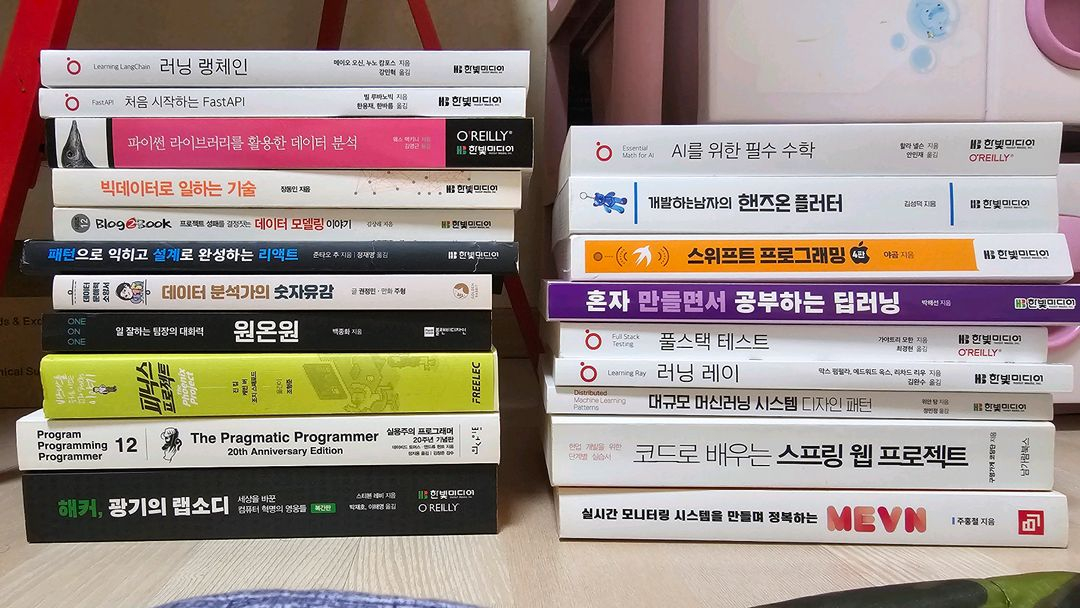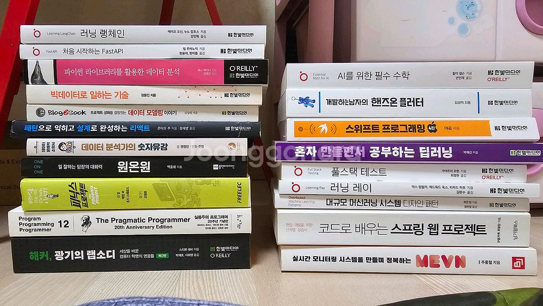 다양한 프로그래밍과 개발 관련 도서들이에요. AI 수학, 데이터 분석, 프로그래밍 등 여러 주제의 책들로 구성되어 있습니다. 개발 공부하시는 분께 유용할 것 같아요! 다양한 프로그래밍 관련 서적 모음입니다 - 러닝 랭체인 - 처음 시작하는 FastAPI - 파이썬 라이브러리를 활용한 데이터 분석 - 빅데이터로 일하는 기술 - BlogBook 프로젝트 설계를 결정하는 데이터 모델링 이야기 - 패턴으로 익히고 설계로 완성하는 리액트 - 데이터 분석가의 숫자유감 - ONE on ONE 일 잘하는 팀의 대화력 - 패스트캠퍼스 Java - Program Programmer 12 - 해커, 광기의 랩소디 책 별도로 권당 저렴하게 판매합니다. 합친 가격 아닙니다. 문의주세요. 😆