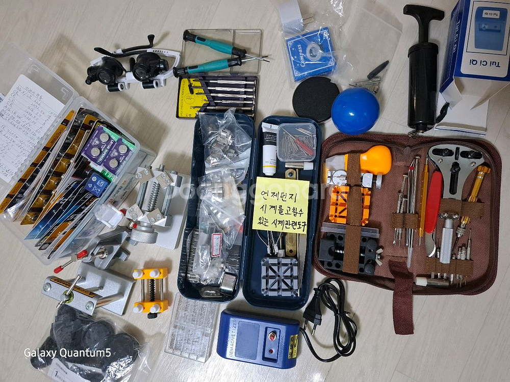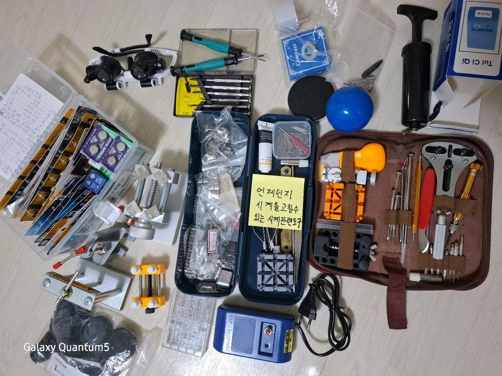 전기레인지와 시계 수리용 각종 도구들이 포함된 세트예요. 전기레인지 박스도 있고 다양한 시계 부품과 수리 도구들로 구성되어 있어서 시계 수리나 전기레인지 교체용으로 활용하기 좋을 것 같아요.