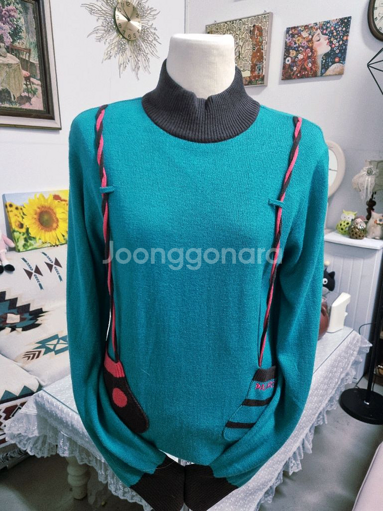 폴웨어 니트 스웨터예요! 틸 컬러에 핑크와 블랙 포인트가 들어간 예쁜 디자인이에요. 상태 양호하고 따뜻하게 입기 좋아요.