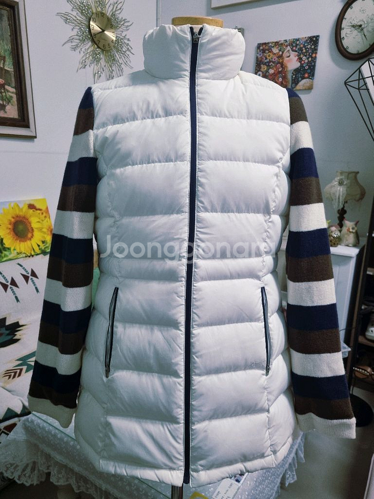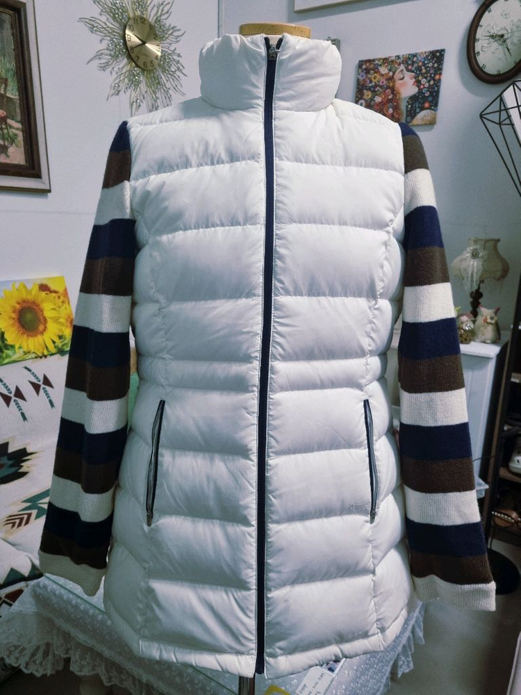 깔끔한 화이트 베이스에 브라운과 네이비 스트라이프 포인트가 들어간 패딩 점퍼예요. 후드가 있어서 실용적이고 스타일리시해요. 상태 양호합니다!