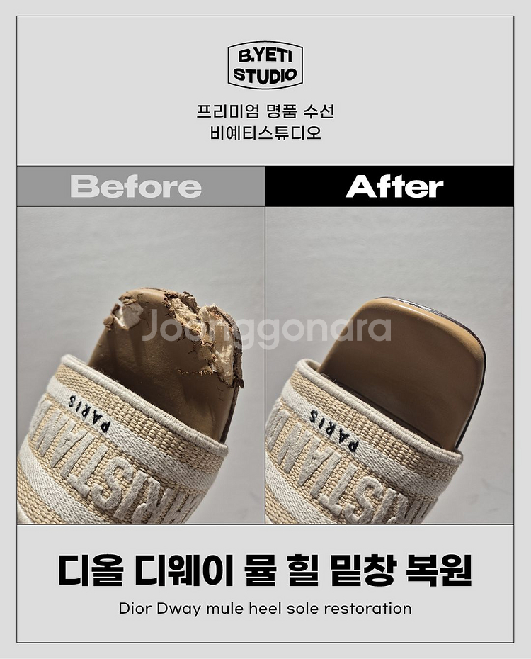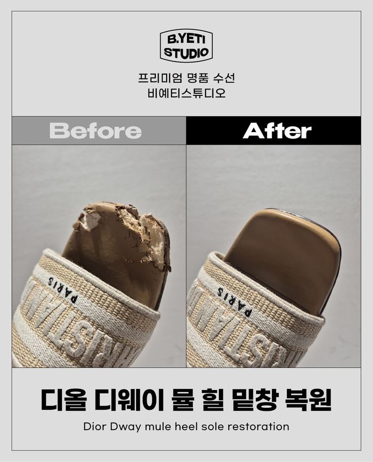 운동화, 샌들, 슬리퍼, 로퍼, 구두, 힐, 부츠, 어그, 슬립온.... 📢 각종 신발 수선, 세탁, 황변제거, 밑창보강해드립니다. 👉낡고 헤진 신발 👉뒤꿈치가 헤지고 구멍난 신발 👉누렇게 변색된 신발 👉메쉬 부분에 구멍난 신발 👉집에서 빨아도 얼룩이 안지워지는 신발 👉미끄러운 신발 👉쿠션감없이 딱딱한 신발 👉밑창이 끈적하게 녹아내린 신발 👉밑창 한 쪽만 닳은 편마모 신발 문제가 생긴 모든 신발 ★비예티스튜디오★에 맡겨주세요! - 칼로 긁어도 벗겨지지 않는 화이트닝 기술 - 뒤꿈치 패드 완벽 수선 - 이태리 정품 비브람 소재 밑창보강 - 고급 자재 사용 - 고급 세탁 기술 보유 타업체와의 차이점을 확인하세요! 명품은 명품을 잘 아는 수선사에게 맡기세요! ★비예티스튜디오★는 명품업계 오랜 노하우와 경험을 가진 수선사입니다. ★전국 어디든 방문 수거 서비스★ 직접 오시지 않고도 제품을 맡기실 수 있습니다. ★수선, 리폼 문의하는 방법★ 1. 신발의 문제 부분을 사진 찍는다. 2. 채팅으로 사진과 함께 수선 내용을 보낸다. 3. 작업기간과 비용을 안내 받는다. ※ 해당 금액은 임의로 기재된 금액이며, 수선 내용에 따라 금액이 상이하므로 정확한 금액은 상담 후 안내드리겠습니다😊