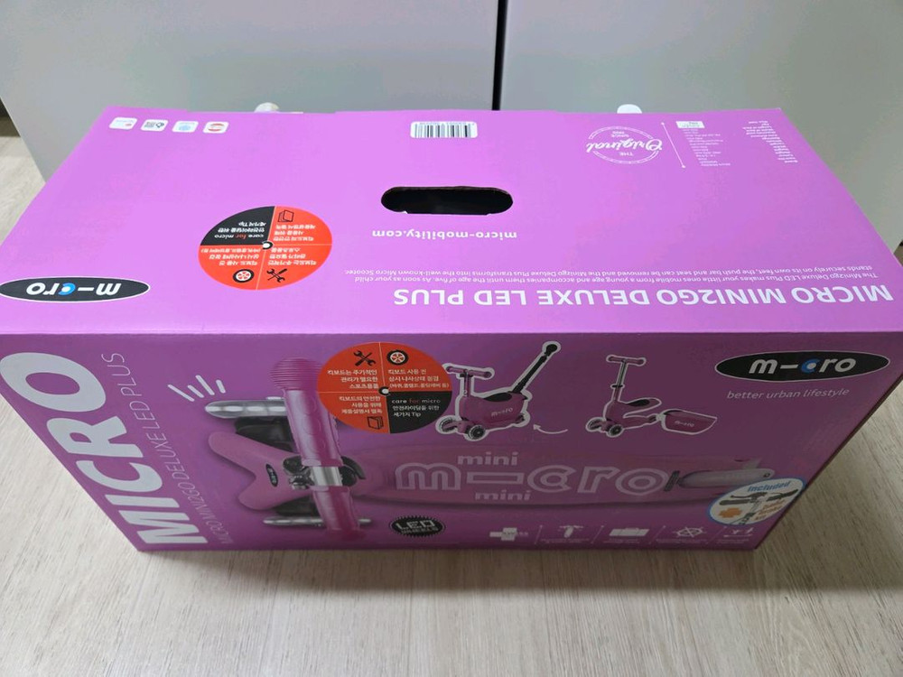 마이크로킥보드 미니투고 디럭스 플러스 LED 추가 구성품 판매합니다. 10월에 구매한 상품이고, 추가 구성품 누락여부 확인 차 개봉해 사진만 찍고 박스에서 꺼내보지도 않은 미사용 새상품입니다. 마이크로킥보드코리아 제품이고 정품등록 및 AS 가능합니다. 거래완료후 정품등록시 필요한 사항 알려드립니다. *미니투고 디럭스 플러스 LED (핑크 색상) + 푸쉬바 +스쿠터벨(15,000원 상당) + LED 라이트(14,000원 상당) 직거래는 용인 수지(수지고등학교 근처)에서만 가능합니다. *에누리 문의는 사양합니다. 공일공 이구삼팔 삼오삼오