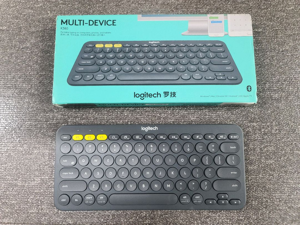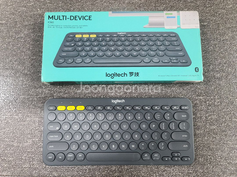 로지텍 K380 멀티 디바이스 무선 키보드입니다 구입후 한번 사용후 그대로 보관만 했습니다. 별도 구입한 전용 파우치 함께 드립니다.