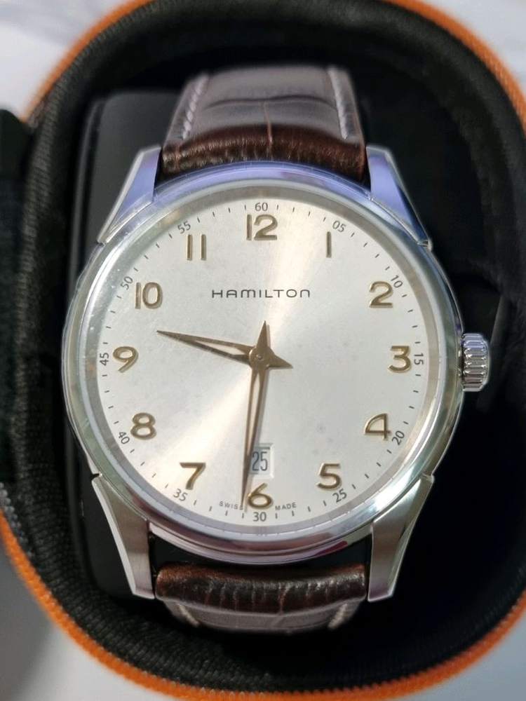 해밀턴 재즈마스터 씬라인 시계 판매합니다. 인기 많은 샴페인 골드 42 mm 입니다. 선레이 다이얼과 핸즈의 조화가 고급스러운 색상입니다. 보증서, 책자, 케이스 풀구성으로 비닐 뜯지 않은 새상품 입니다. 생각했던 코디와 맞지 않아 내놓습니다. SWISS MADE - Size: 42mm - Sapphire Crystal - Movement: Quartz 쿨거래 하시면 적정선에서 가격 제안 받습니다. 그외 할인 요청 받지 않으니 양해 부탁 드립니다. 다른 상품과 같이 구매하면 할인해드릴게요. 파손면책 동의, 노리턴 택배 거래 가능합니다. 소모성 질문 답변 안합니다. 구매하실 분만 연락주세요. * 교환, 환불 불가 서로 시간 낭비, 에너지 소모하지 않도록 매너 거래 부탁 드립니다. 대화 시, 구매하지 않으시더라도 "구매 안한다, 생각해보겠다." 라는 말씀은 해주셨으면 합니다. 대화를 잘 마치는 것도 상호 간의 존중, 매너라고 생각합니다. 감사합니다.