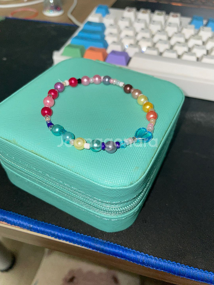 다양한 색상의 비즈로 만들고, 파란 하트를 포인트로 넣은 컬러풀한 비즈 팔찌예요. 길이: 약 26cm(정확하지는 않지만 제 손목 두께보다 약간 큽니다) 상태 양호하고 착용감도 좋습니다.(접착제 바를 때 잘못 발라서 비즈에 묻기는 했지만…<지금은 네일사포? 같은 걸로 대부분 갈아서 비즈 사이에 있는 부분만 빼면 거의 제거했습니다>)