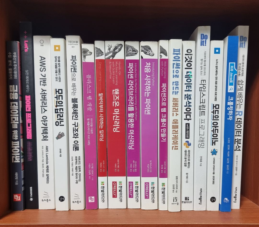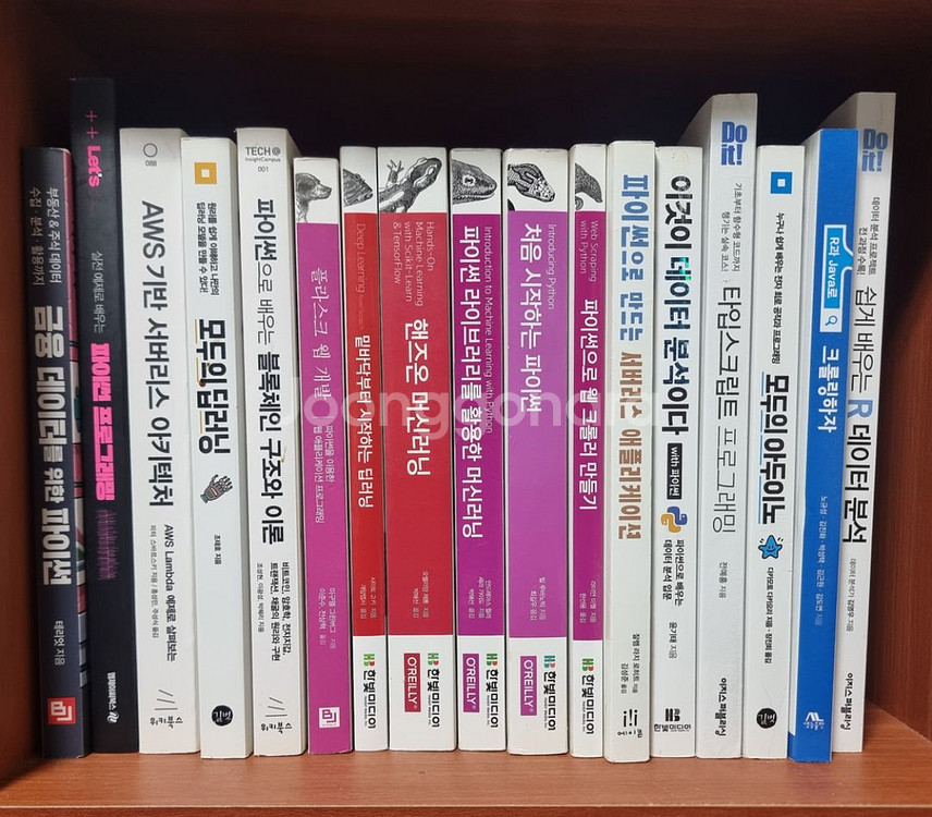 다양한 프로그래밍 관련 전문서적들이에요. 자바, 웹개발, 데이터 분석 등 여러 주제의 책들로 구성되어 있습니다. 개발 공부하시는 분께 유용할 것 같아요! 전부 만원으로 판매합니다. 택배비 별도입니다. 금융 데이터를 위한 파이썬 정가 24,000원 실전 예제로 배우는 파이썬 프로그래밍 정가 22,000원 파이썬으로 만드는 서버리스 애플리케이션 정가 25,000원 AWS 기반 서버리스 아키텍처 정가 30,000원 파이썬으로 배우는 블록체인 구조와 이론 정가 27,000원 Do it! 쉽게 배우는 R 데이터 분석 정가 20,000원 Do it! 타입스크립트 프로그래밍 정가 25,000원 모두의 딥러닝 정가 24,000원 모두의 아두이노 정가 16,000원 R과 Java로 크롤링하자 정가 20,000원 Java의 정석 1 (3rd Edition) 정가 30,000원 Java의 정석 2 (3rd Edition) 정가 30,000원 해킹 방어를 위한 JAVA 시큐어코딩 정가 30,000원 (한빛미디어) 플라스크 웹 개발 정가 26,000원 밑바닥부터 시작하는 딥러닝 정가 24,000원 핸즈온 머신러닝 정가 33,000원 파이썬 라이브러리를 활용한 머신러닝 정가 30,000원 처음 시작하는 파이썬 정가 30,000원 파이썬으로 웹 크롤러 만들기 정가 24,000원 이것이 데이터 분석이다 with 파이썬 정가 28,000원 앵귤러 첫걸음 정가 28,000원