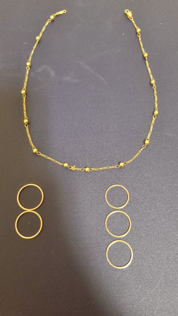 [총6개일괄]NADRI 18kGF 볼 체인 목걸이1개+패션반지5개(악세서리) 모두 포함가격입니다. 따로 판매안해요~ NADRI 18KGF 볼체인 목걸이 골드 체인 도금 선물 부드러운 라인을 형성하여 세련되고 우아한 느낌을 줍니다. 특별한 날에는 다른 액세서리와 함께 레이어링 하여 포인트 액세서리로 사용할 수 있습니다. 일반적인 도금보다 내구성이 뛰어나고 변색이 적어 오랫동안 사용할 수 있습니다. -목걸이 줄이 묶여 있는데 잘 안풀어지네요.(사진참고)하세요.상관없이 착용하시고 다니실분 추천~ 길이 : 대략 40.5cm 소재 : 18K GF *수량 : 1개 골드필드란 미국 특허 제품으로 화학용액에 담가 도포하는 도금과는 달리 알러지 발생률이 적고 도금보다 수명이 긴 장점이 있습니다. 보통 골드필드(줄여서 GF) 18kgf - 금박을 입힌 금 (gold filled) 18kgf는 표면에 금박을 입혀서 만든 제품입니다 Gold filled 임을 증명하는 GF마크가 새겨져 있습니다. 깔끔하고 심플해서 데일리로 착용하기 좋아요. 캐주얼이나 포멀한 느낌의 코디 등 어디에나 다 잘 어울린답니다 : 반지는 세손가락 레이어드하거나 한손가락에만 착용해도 여리여리한 느낌 정말 예쁘답니다. 손가락 마디부분에 끼고다니셔도 이쁩니다~^^ 사이즈는 사진참고 반지2개 찍힌 사진은 같은 사이즈예요(쌍반지하고다니시면이뻐요) 생활감 사용감 있으며 예민하신 분은 거래 삼가해주시고 에눌문의X 꼭 하실분만 연락주세요 중고물품상 외하자로 반품환불 ××××