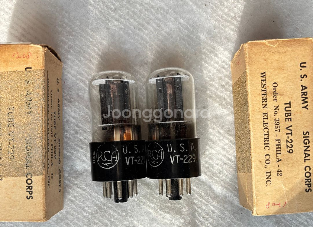 RCA 6SL7gt 메치페어 (2개) 판매. * RCA OEM: RCA가 웨스턴 일렉트릭(WE: Western Electric)에 납품한 관. - 군용관: VT-229 - Big base NOS: 미사용재고 - Same Date Code: K5E (1958년 9~10월 미국산) NIB: 오리지날 군용통 280,000원(우체국 택배비 포함) 010 사오39 구구40 (서울, 문자환영)