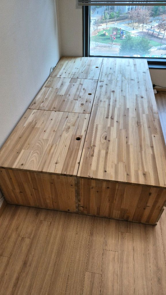 편백나무 수납침대 수퍼싱글 사이즈 2000×1100×440 한쪽은 수납함 한쪽은 서랍 5칸으로 수납이 잘되고 튼튼합니다. 가운데 분리되서 높이가 괜찮다면 벤치소파로도 사용가능합니다 서랍 방향도 조절 가능합니다. 고정 원목도 따로 있어서 같이 드립니다. 저는 라텍스 매트를 올려셔 사용해서 일반 매트리스 프레임보다 높이가 높은 편입니다.(440) 부분 부분 노랗게 보이는 부분은 오염은 아니고 원목에서 나오는 성분때문에 색이 저렇게 된 것 같아요 원목 그대로 재질이라 서랍 앞쪽에 자잘한 찍힘 같은 사용감 있습니다. 40만원 정도에 구매했습니다. 다산리코빌파크뷰 오피스텔로 가지러 오셔야 합니다.