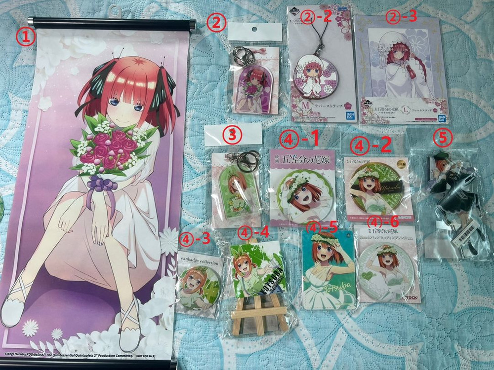 ### 무리한 에눌, 교환 및 환불 ❌❌❌ ### ❗ 일괄금액이 아닌 각 상품별 금액대 기재되어 있으니 참고후 문의주시면 감사하겠습니다 :D ❗ 판매자측에서 조금의 하자는 잘 파악하지 못할 수 있습니다. 그 부분을 감안해서 가격인하로 판매하고 있으니 참고해주시면 감사하겠습니다 😊😊😊 ✅ 모든 상품 "미개봉" & 택미포 가격입니다. ✅ 상품 및 배송비관련 에눌문의 ❌❌❌ ✅ 교환 및 환불은 어려운점 참고 부탁드립니다. → 그 밖에 궁금하신 부분은 편히 문의주세요!!! ㅎㅎ 💖 각 상품별 안내 ✅ 나카노 니노 굿즈 "일괄 구매"시 : 니노 사각 캔뱃지 무료증정 ✅ 나카노 요츠바 굿즈 "일괄 구매"시 : 요츠바 미니 아크릴 스탠드, 아크릴 키링 무료증정 + 반택무료 서비스 << 1번째 사진 >> 1. 상품명 : 5등분의 신부 나카노 니노 애니플러스 한정메뉴 특전 족자봉 ✅ 판매완료 2. 상품명 : 5등분의 신부 나카노 니노 굿즈 ✅ 가격 : (1) 2번 아크릴 키링 : 판매완료 (2) 2-2번 러버스트랩 : 0.6 (3) 2-3번 프레임 스탠드 : 0.8 ✅ 상태 : 미개봉 ✅ 상품설명 : 미개봉으로 보관만 했습니다. 3. 상품명 : 5등분의 신부 나카노 요츠바 아크릴 키링 ✅ 가격 : 1.2 ✅ 상태 : 미개봉 ✅ 상품설명 : 미개봉으로 보관만 했습니다. 4. 상품명 : 5등분의 신부 나카노 요츠바 굿즈 ✅ 가격 : (1) 4-1번 캔뱃지1 : 0.5 (2) 4-2번 캔뱃지2 : 0.5 (3) 4-3번 캔뱃지3 : 0.4 (4) 4-4번 미니 캔버스 : 판매완료 (5) 4-5번 카드케이스 : 판매완료 (6) 4-6번 캔뱃지4 : 0.5 ✅ 상태 : 미개봉 ✅ 상품설명 : 미개봉으로 보관만 했습니다. 5. 상품명 : 5등분의 신부 나카노 요츠바 아크릴 스탠드 ✅ 가격 : 1.4 ✅ 상태 : 미개봉 ✅ 상품설명 : 미개봉으로 보관만 했습니다. ------------------------------------------------------------------------------------------ << 2번째 사진 >> 1. 상품명 : 5등분의 신부 제일복권 일러스트 보드 ✅ 가격 : 개당 0.5씩 ✅ 상태 : 미개봉 ✅ 상품설명 : 미개봉으로 보관만 했습니다. → 수량은 요츠바 2개, 이치카 1개, 이치카 1개 → 일괄구매시 : 2.0 2. 상품명 : 5등분의 신부 미니 클리어파일 [* 남은 재고 : 이치카, 미쿠] ✅ 가격 : 개당 0.3씩 ✅ 상태 : 개봉 ✅ 상품설명 : 상태확인차 개봉후 보관만 했습니다. → 일괄구매시 : 0.5 3. 상품명 : 5등분의 신부 미니 클리어파일 웨딩드레스 3종 [일괄판매 ⭕ / 낱개판매 ❌❌❌] ✅ 가격 : 1.0 [일괄기준] ✅ 상태 : 개봉 ✅ 상품설명 : 상태확인차 개봉후 보관만 했습니다. 📦 배송정보 ✅ 일반배송 : cu편의점택배 +0.35 ✅ 반값배송 : cu편의점끼택 +0.22 [단, gs의 경우 집근처에 없어 접수가 어렵습니다 ㅠㅠ] ✅ 우체국배송 : +0.4 [단, 오후 3시이후 구매시 다음날 접수가능]