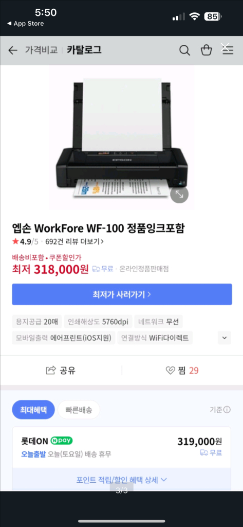 엡손 워크포스 WF-100 와이파이 연결 가능하고 상태 양호합니다. 박스 잉크 미포함
