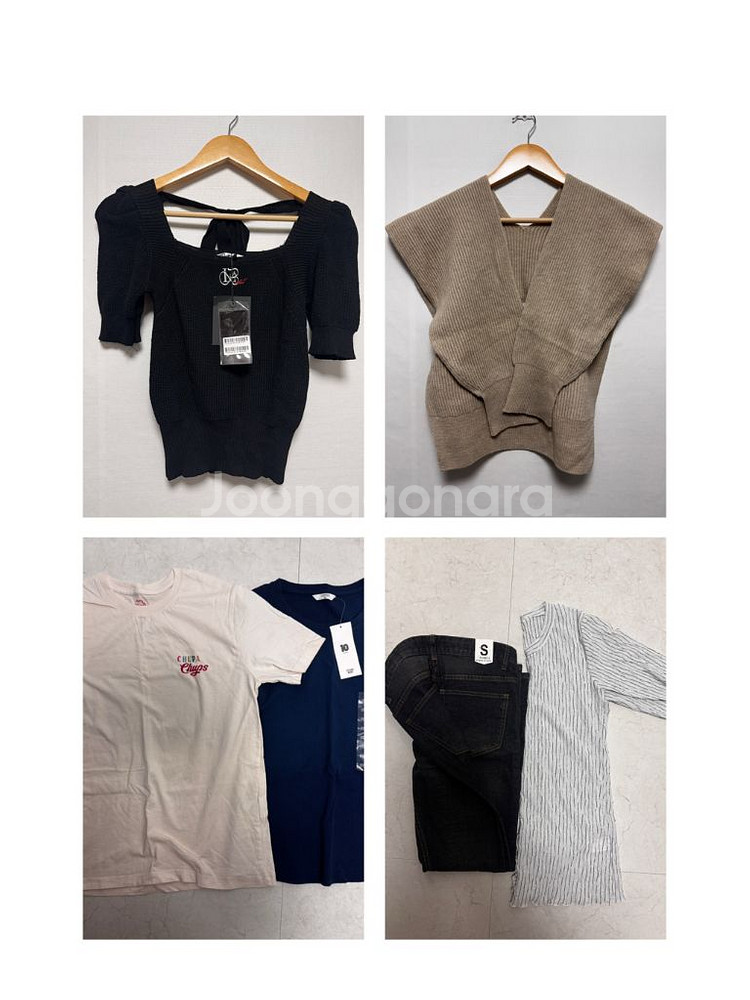 새상품이거나 1회시착이요 1. 니트반팔 뒤로 끈 묶는 스타일 크롭기장 원가 69000원인가했어요 새상품 7000원 2. 니트숄 새상품 텍없음 걸치는 스타일 5000원 3. 탑텐 티셔츠 새상품 1개 일괄 5000원 4. 일자청바지S새상품+반팔티 5000원