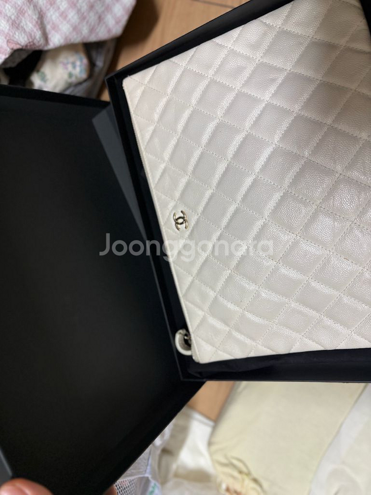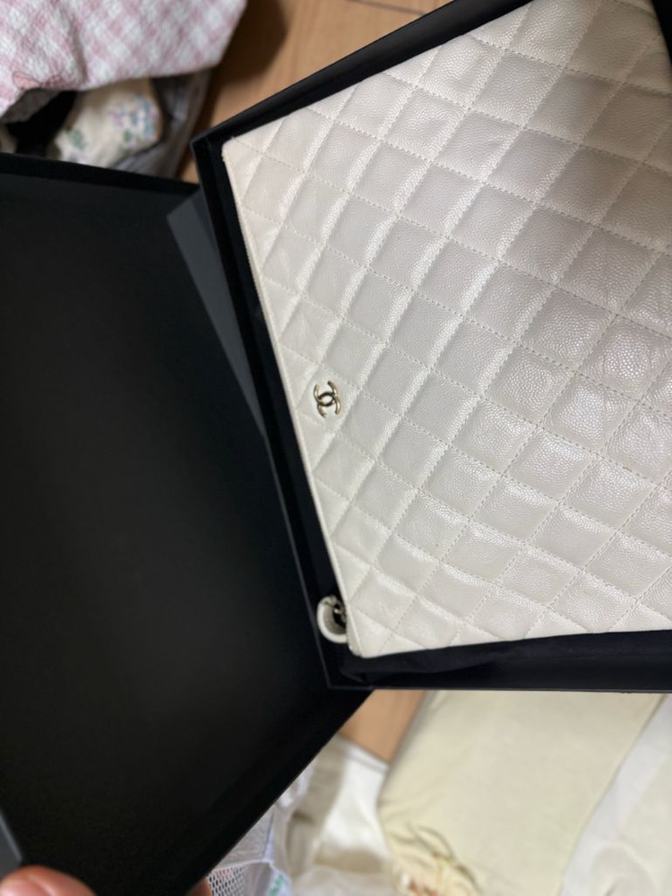 고급스러운 샤넬 화이트 캐비어 뉴미듐 클러치입니다. 퀼팅 디자인이 세련됨을 더하고, 중앙의 로고가 포인트가 되어줍니다. 화이트라 염색하기도 좋고 한번 업체세탁맡겨서 사용하셔도돼요 흔하지 않아서 소장용으로도 좋아요! 안에 이너백을 넣고 사용했지만 화이트라 사용감이 좀 있습니다 사진참고 해주세요 풀박스 /영수증 다 있습니다. 문의 없으시면 바로 안전결제해주시면 됩니다!