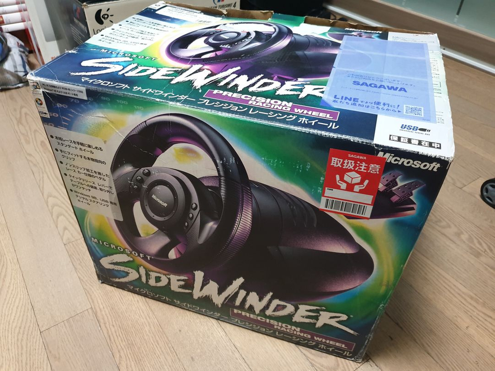 1999년에 출시한 마이크로소프트 사이드와인더 프리시전 레이싱 휠 입니다. 번지코드로 중앙 자동 정렬되는 휠이며 포스피드백 기능은 없습니다. 어느 윈도우즈 에서든 꽂으면 바로 인식하고 사용가능합니다만 사이드 와인더 프로그램이 윈도우 XP까지만 동작하며, 앱에서 지원하는 핸들 민감도 조절, 페달의 축 분리/통합 기능의 설정을 이후 운영체제에서는 할 수 없기 때문에 권장하지 않습니다. 하지만 xp에서도 일부 보드에서는 드라이버가 동작하지 않는 경우가 있어, 윈도우98 이하 운영체제를 사용하는 레트로 PC 에서 실사용 하실 분들이 가져가시길 바랍니다. 휠베이스에는 상처가 있으며 페달에는 테이프 떼진 흔적이 있으나 끈적거리지는 않습니다.