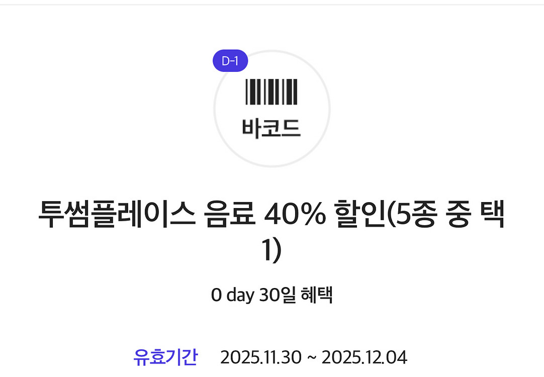 📌유효기간: 2025.12.04 음료 40% 할인(5종 중 택1) * 윈터 뱅쇼: 정가 6,500원 → 할인가 3,900원 * 윈터 뱅쇼 로우 슈거: 정가 6,500원 → 할인가 3,900원 * 구운 밤 라떼: 정가 5,800원 → 할인가 3,480원 * 스트로베리 초콜릿 라떼: 정가 5,800원 → 할인가 3,480원 * 아메리카노(HOT/ICE): 정가 4,700원 → 할인가 2,820원 * 다른 메뉴로 변경하실 수 없습니다. * 아메리카노 선택 시 디카페인 원두 옵션을 적용하면 혜택을 받으실 수 없습니다. 📌 쿠폰 사용방법 키오스크 이용 방법: 혜택 메뉴 선택 > 메뉴 담기 > '결제 방법 선택'에서 [SKT 할인] 버튼 누르기 > '프로모션 할인 선택'에서 맨 위 [투썸하트 쿠폰, 쿠폰/바코드 할인] 체크> 쿠폰 스캔 > 남은 금액 결제 결제하기 전 매장 직원에게 0 day 혜택이라 말하고 쿠폰 바코드를 보여 주시기 바랍니다. 입금확인 후 쿠폰 바로 보내드립니다!