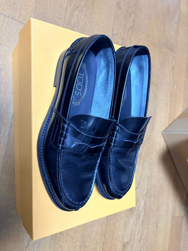 토즈 정품 레더 로퍼 250-255입니다 사이즈가 여유롭게 나와서6( 250-255)으로 구매했어요 11월에 구매해서 실외에서 세번 착용했습니다