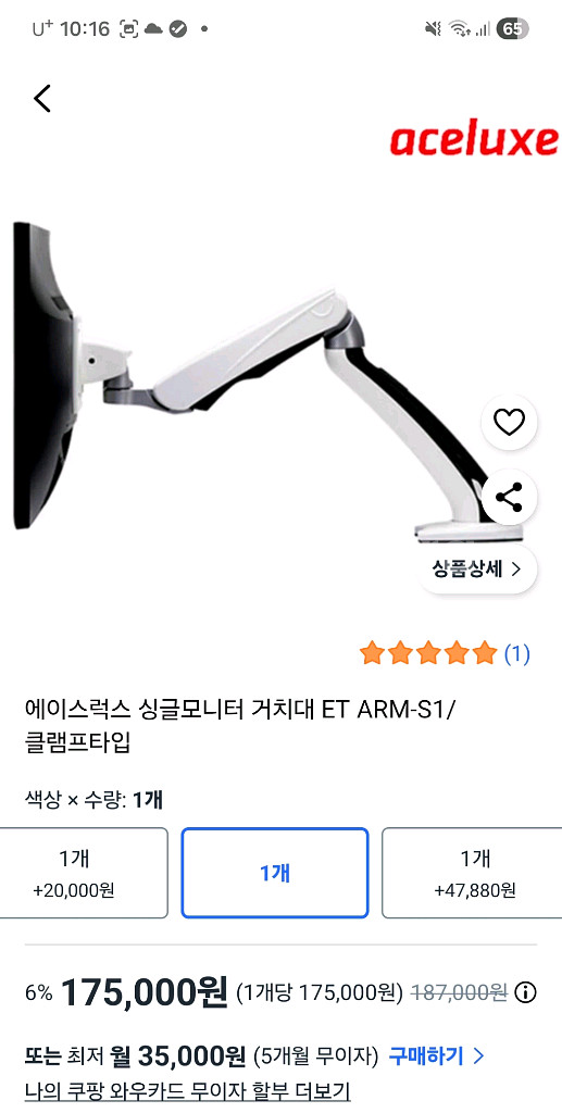 에이스럭스 고중량 싱글 모니터암 ET ARM-S1입니다. 클램프 타입으로 설치가 용이하고, 모니터를 자유롭게 움직일 수 있어서 편리합니다. 일반 모니터암에 비해 비싼 이유는 말도 안되게 튼튼합니다. 40인치 TV를 거치해도 흔들림없이 사용 가능합니다.