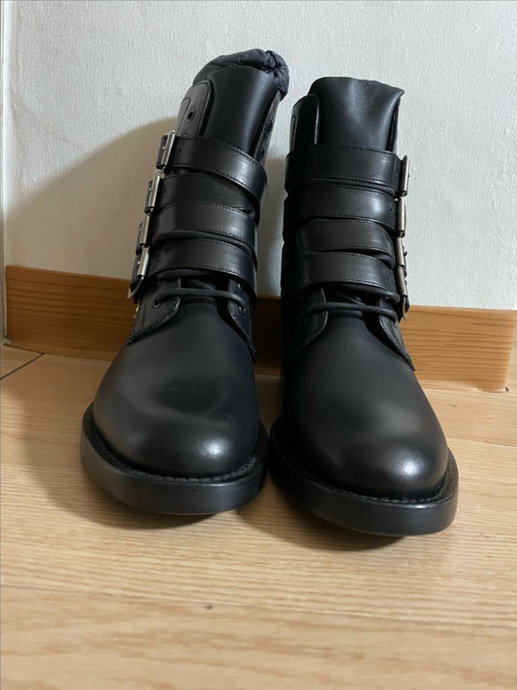 생로랑의 시크한 블랙 레더 버클 부츠입니다 사이즈는 240입니다 소가죽이구요 굽은 2.5cm정도이고, 높이는 21cm정도입니다 보관만한 새상품입니다 독특한 버클 디테일이 돋보이며, 어떤 스타일에도 잘 어울립니다 영수증은 보관 못했구요 아울렛에서 직접 구입한 상품입니다 교환 환불 불가