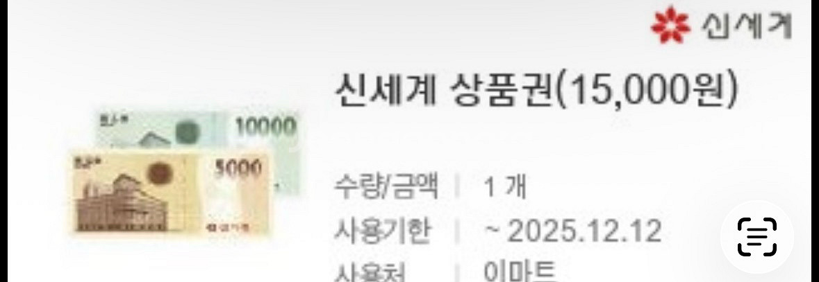신세계 상품권 15,000원권 2장입니다. 사용기한은 2025년 12월 12일까지로 넉넉해요. 이마트에서 교환가늠하십니다