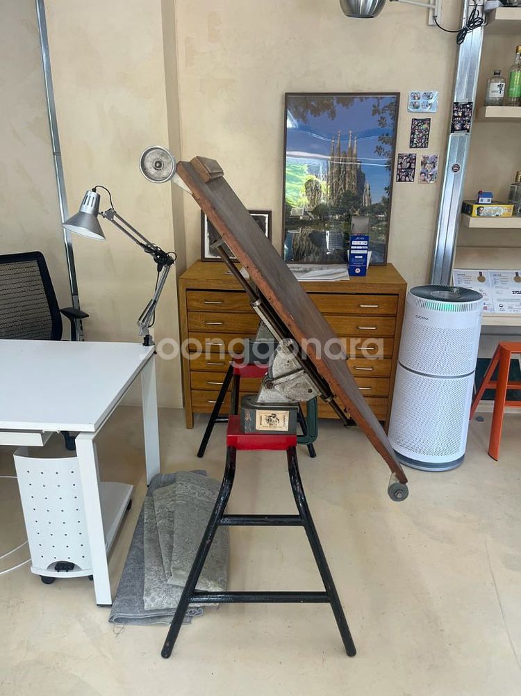 영국에서 제작된 빈티지 제도판입니다. 상판과 다리 분리가 가능하며, 컨디션은 사진과 같습니다. 건축사무소를 운영하고 있어 3년 전 파주 출판단지에서 가구 공장을 운영하시는 분에게 장식용 소품으로 구입하여 수집하였습니다. 빈티지 제품에 대한 이해도가 있는 분이 가져가시길 바랍니다. 수집한 그대로이며 (이전에 쓰시던 분이 본인 회사 이름을 적은 고정용 문진을 위에 박아두셨네요) 실사용을 아예 하지 않아서, 한번 철물을 손보고, 가볍게 샌딩과 마감을 하시는게 좋을 것 같습니다. 현재 원목으로 제작된 근대 이전 제도판은 매물이 거의 없습니다. 크기가 크고 무거워 용달을 부르셔야 할 것 같아, 그대로 가져가시는 조건으로 구입한 가격의 절반으로 저렴하게 판매합니다. 가격은 30만원이며, 분당 정자동에 위치한 사무실에서 직거래 가능합니다. **배송비 / 용달비 미포함이며, 배송해드리지 않습니다. 직접 용달 부르시거나 방문하여 가져가셔야 합니다** 다리 분리가 가능하지만 원목으로 튼튼하게 제작되었고, 다리가 철물이라 무게가 상당하며, 빈티지 제도판 특성상 사이즈가 큽니다. 제도판이 어느정도 현대화되기 이전에는 설계의 용이성을 위해 지금 사용하는 것보다 훨씬 큰 제도판이 필요했었습니다. 부피도 크고 무거워서 최소 성인 남성 2명이 옮기셔야 할 것 같습니다. 용달 부르실 때 감안하세요. 직접 옮기시려면, 트럭을 가지고 오셔야 할 것 같습니다. 빈티지 물건이라 분리한 적도 없고 분리시 컨디션을 장담 못합니다. 사이즈 확인하세요. 상판 사이즈ㅡ 1360*1130*370 다리 사이즈ㅡ 1360*370*670