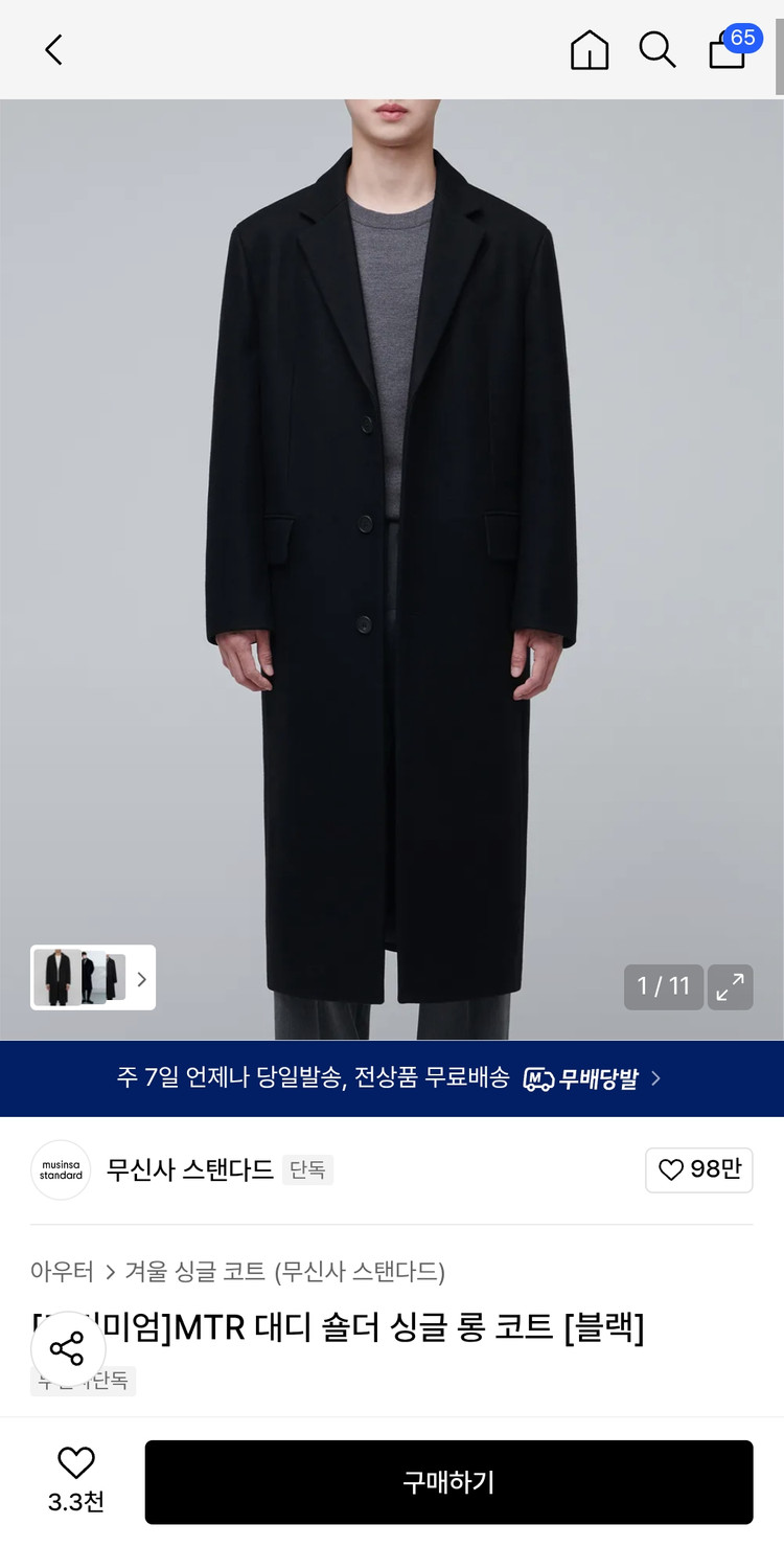 무신사 스탠다드 브랜드의 MTR 대디 숄더 롱 코트예요. 깔끔한 블랙 컬러로 어떤 스타일링에도 잘 어울리고, 정확히 2회 정도 착용했습니다. 사이즈가 약간 작아서 판매합니다. 사이즈는 XL 입니다. 실측은 사진에 나와있습니다. 택배비 포함이며 직거래는 구의동에서 가능합니다.
