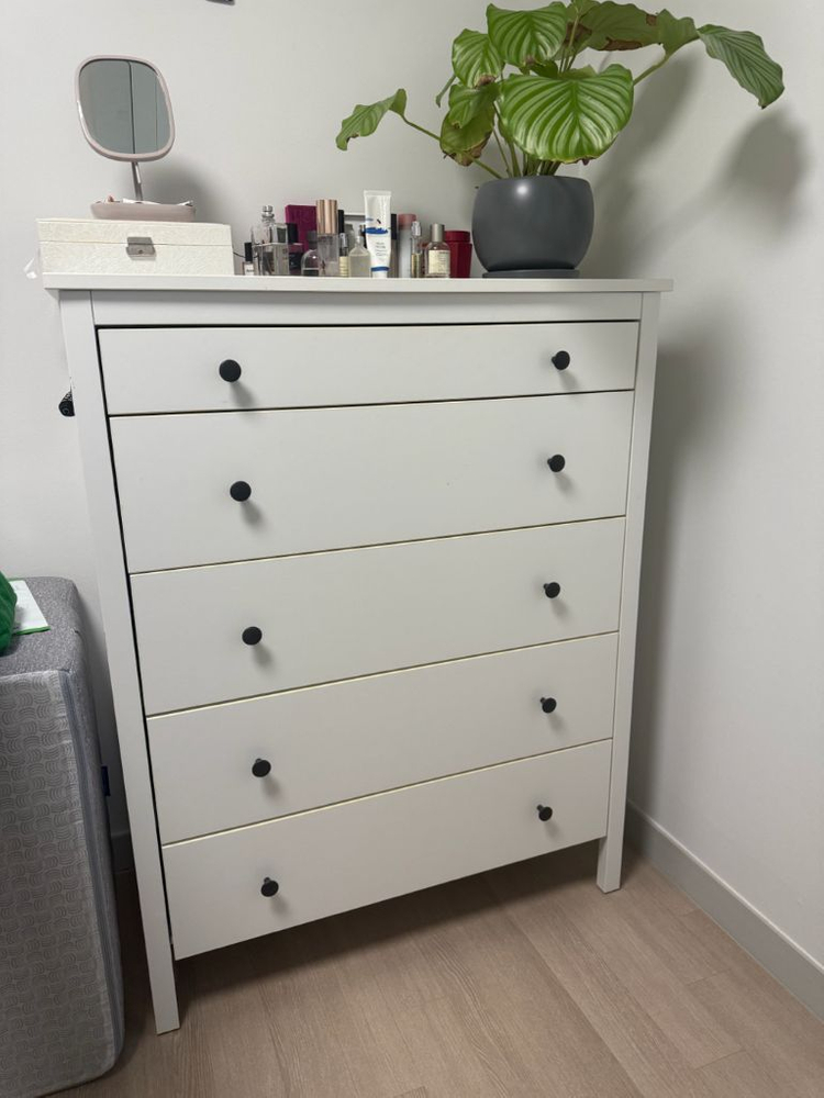 개인정보(거래정보)를 주고받는 행위는 사기에 노출될 수 있으므로 즉시 중고나라로 신고해 주세요깔끔한 화이트 컬러의 5단 서랍장이에요. 블랙 손잡이가 포인트로 되어있고 상태도 양호합니다. 수납공간이 넉넉해서 실용적이에요. IKEA KOPPANG 90 x 114 cm