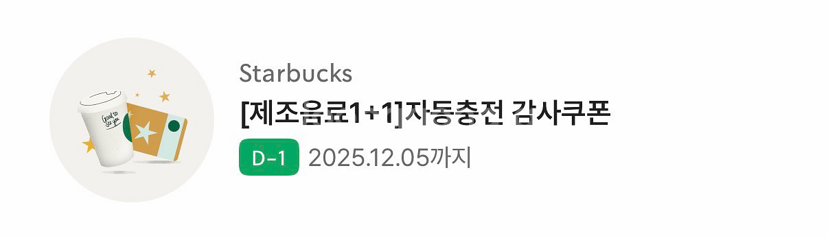 개인정보(거래정보)를 주고받는 행위는 사기에 노출될 수 있으므로 즉시 중고나라로 신고해 주세요스타벅스 제조음료 1+1 자동충전 감사쿠폰이에요. 2025년 12월 5일까지 사용 가능하고, 동일한 음료 1잔 무료 제공할 수 있어요!