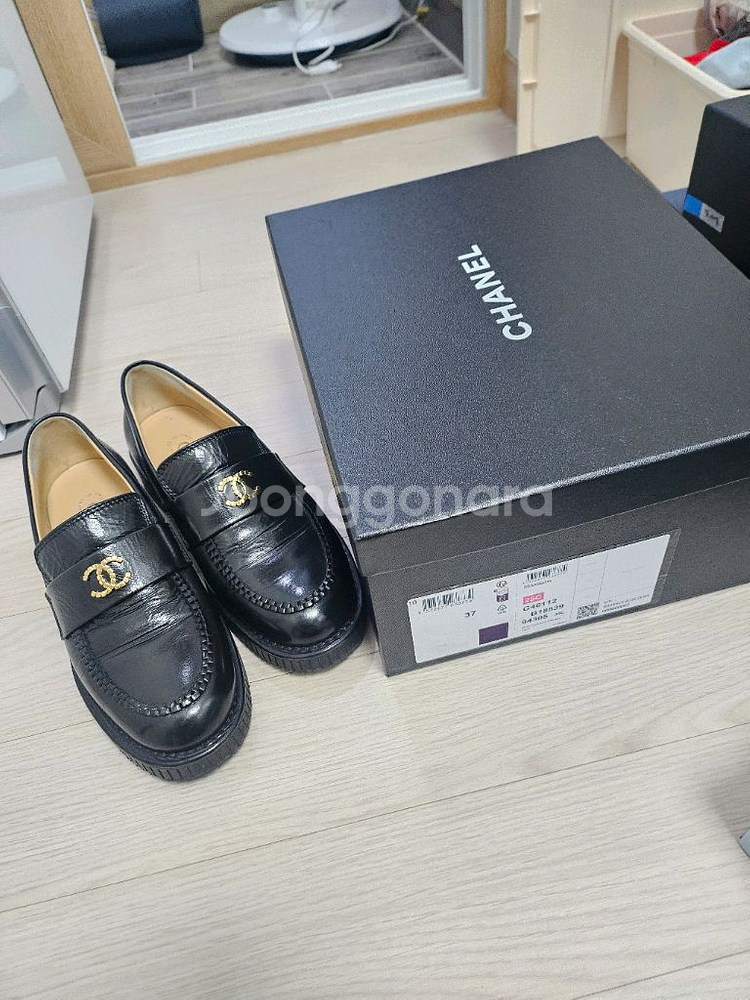 정품 발레리나 플랫슈즈예요. 블랙 컬러에 골드 로고 장식이 포인트이고, 박스와 함께 판매합니다. 상태 양호한 중고 제품입니다.