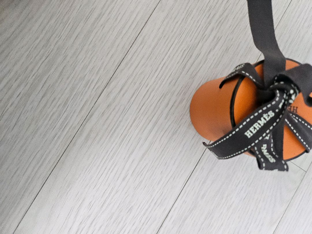 에르메스 정품 가죽 파우치예요. 오렌지 컬러의 고급스러운 가죽 소재로 제작되었고, 에르메스 특유의 블랙 스트랩이 포인트입니다. 상태 양호한 중고 제품으로 실용적인 크기로 사용하기 좋아요.