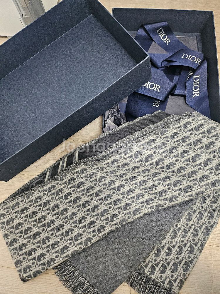 정품 디올 오블리크 패턴 머플러예요. 박스와 리본까지 모두 포함되어 있고 상태도 깔끔합니다. 고급스러운 그레이 컬러로 어떤 스타일에도 잘 어울려요.