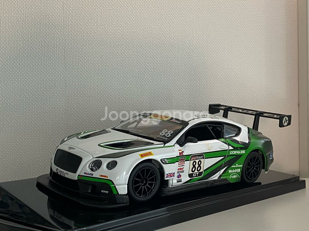 1/24 스케일 부라고 벤틀리 컨티넨탈 GT3 입니다 흰색, 검은색, 초록색 데칼의 조합이 멋스럽네요 섬세하게 디자인되어 소장 가치 있습니다 사진에 케이스 포함입니다