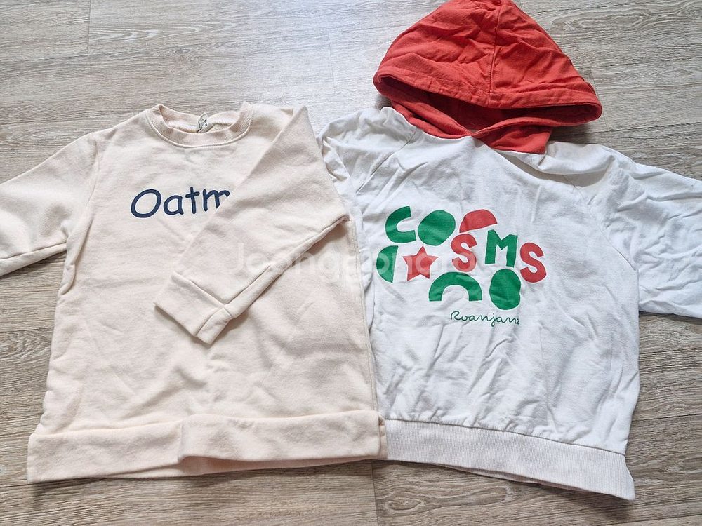 베이지색과 화이트색 아동 상의 2벌이에요. 베이지색은 Oatmeal 로고가 있고, 새상품입니다 화이트색은 로아앤제인 입니다 일괄 착불 9천 입니다