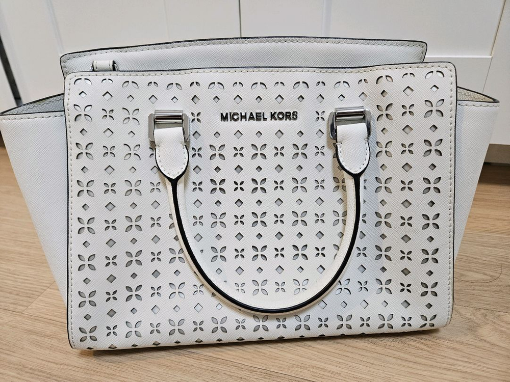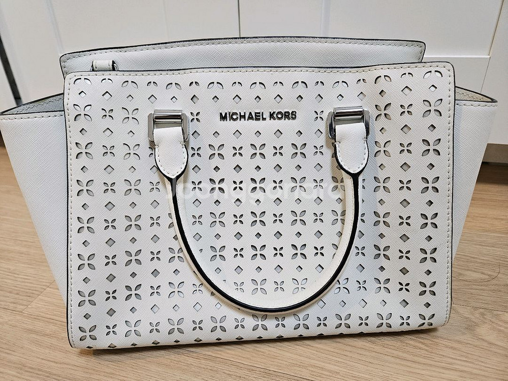 마이클코어스 흰색 토트백 전체적으로 펀칭 디테일이 들어가있어 독특하고 예쁨 사용감 많지 않고 상태 양호 택포 3만원