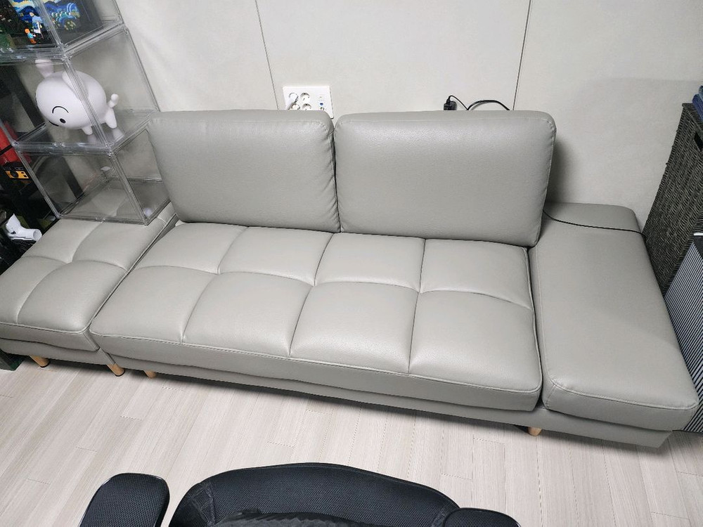 깔끔한 그레이 컬러의 가죽 소파예요. 커버를 사용해서 전체적으로 상태 양호하고 편안한 착석감을 제공합니다. 거실 인테리어에 잘 어울리는 모던한 디자인이에요. 스툴포함 가로 2250mm 스툴제외 1750mm 깊이 850mm 남양주 다산동 입니다