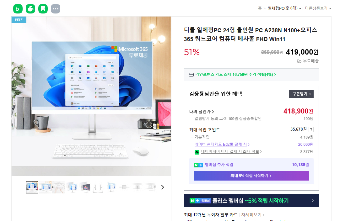 인텔 i5 프로세서와 8GB 메모리가 탑재된 일체형 컴퓨터입니다. 윈도우11이 설치되어 있고 사무용이나 일반 사용에 적합해요. 깔끔한 화이트 디자인으로 어디든 잘 어울립니다.