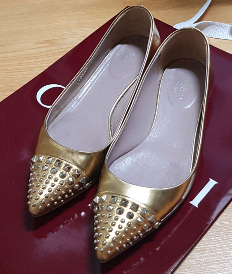 현대백화점 구찌 매장 구입, 구찌 골드 컬러 35 사이즈 슈즈 판매해요. 굽은 1.5cm로 아주 편합니다. 레더플레인에서 앞뒤 비브람 창 새로 댄지도 얼마 안되서 바로 신으시면 됩니다