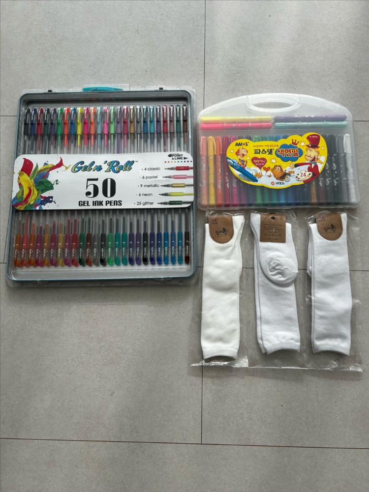 (새제품) 젤펜 50색 세트 + 파스넷 +아동 반스타킹3켤레 (미개봉 포장그대로 새상품) 반짝이 형광 젤펜 50색, 파스넷 크레용, (9-10세 내외) 반스타킹 양말 3켤레가 함께 있는 세트 직거래 or 방문택배 착불