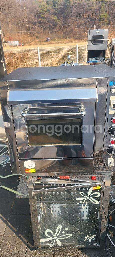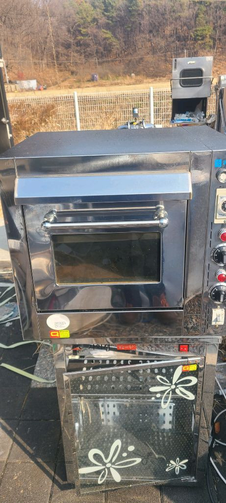 업소용 대형 피자오븐이에요. 스테인리스 스틸 재질로 견고하고 온도 조절 다이얼과 환기 시스템이 잘 갖춰져 있어요. 사용감은 있지만 작동 상태 양호합니다.
