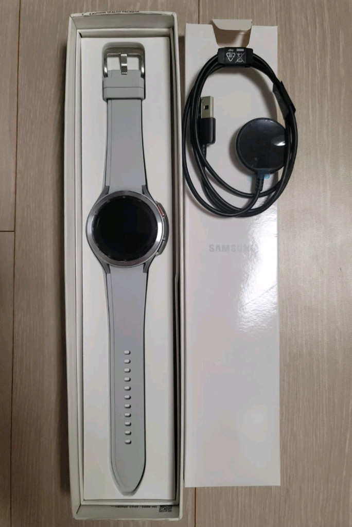 새상품 사서 올해 말에 2번정도 착용했습니다. 실내에서만 착용한거고 밖에 가지고 나가진 않았습니다 거의 새상품이고 풀박스로 있습니다 화면에 워치4용 보호필름 붙여뒀습니다(클래식 용 필름이 아니라 그런지 외곽 부분에 들뜸이 있습니다) 충전기 보호 스티커도 떼지않았습니다 충전기 넣는 부분 박스 윗분이 좀 찢어졌습니다 클래식의 가장 큰 특징은 시계같은 '베젤링'입니다. 베젤링으로 메뉴나 화면 전환을 할 수 있습니다. 부드러운 느낌이 굉장히 좋습니다. 이전 모델과 달리 워치4부터 적용된 기능들이 있어 잘 팔린 모델이며, 가격대비 기능이 잘 나와 인기가 많다 들었습니다. 수면패턴, 만보기, 인바디, 전화, 문자 등 일상생활시 필요한 기능들은 모두 들어있습니다. 저는 워치를 사용하며 수면패턴과 인바디 기능을 가장 유용하게 사용했습니다.