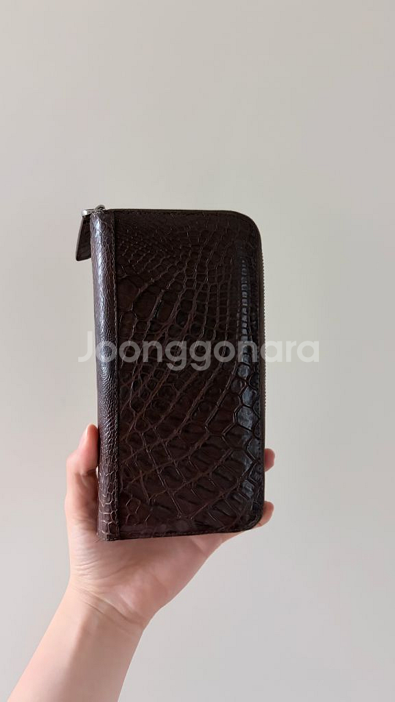 고급스러운 브라운 컬러의 악어 가죽 지퍼 장지갑입니다. 독특한 질감과 디자인으로 인기가 많아요 카드, 지폐, 동전 등을 분리해서 수납하기 용이합니다. 남여공용 입니다!