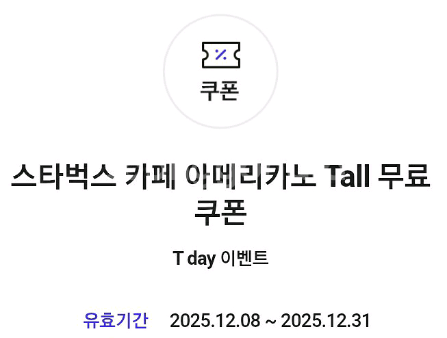 skt 티데이 이벤트 쿠폰입니다 스타벅스 아메리카노 T 1장 사이렌오더 주문불가. 25년12월31일 까지 사용가능중고나라는 안전한 거래 문화를 위해 노력합니다. 사기 예방을 위해 개인정보나 거래 정보를 주고받는 행위는 이용이 제한될 수 있습니다. 안전한 거래를 위해 안심결제를 이용해 주세요.