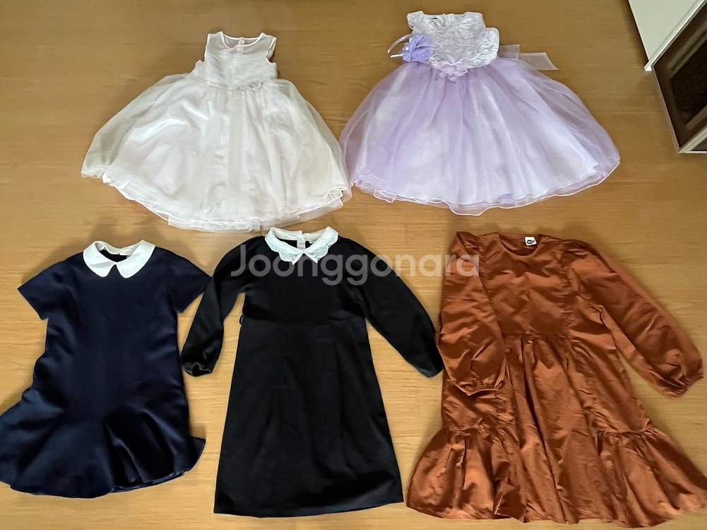 아이가 피아노 연주회 때나 결혼식 등 행사 때 입었던 드레스들 입니다. 대략 140정도 입을때 입었던 것 같은데…각 드레스 총 기장 적어놨으니 참조해주세요. (사진이 다 안올라가 챗주시면 사진 더 보내드립니다) 1. 모다까리나 드레스 140사이즈 – 8000원 : 연한 살구색이고 치마가 4겹으로 굉장히 풍성 합니다, 총 기장 80센티미터 정도 2. DRESS PIA 드레스 15사이즈 + 헤어밴드 – 28000원 : 연한 보라빛 도는 드레스 이고 머리띠와 세트 입니다. 입히면 정말 고급스러워요, 콩쿨 등 연주회 때 입혀도 예쁘고 화동 할때 입혀도 예뻐요. 총 기장 85센티미터 정도 텍이랑 머리띠 안쪽에 검정펜으로 이름 적었다 지운 자국 있어요. 3. Been 빈 원피스 + 칼라 탈부착 155 사이즈 – 9000원 : 진한 네이비 도톰한 모직 원단이고 화이트 목 칼라는 찰부착 가능해요. 결혼식 등에 칼라색상과 같은 화이트 스타킹과 입히면 단정하고 예뻐요. 기장은 67센티미터 정도 입니다, 155사이즈이지만 빈이 작게 나와서 다른 원피스들 입힐때 입혔어요. 4. 일로딜로 원피스 140사이즈 – 7000원 : 검정 긴소매 원피스에 화이트색상 레이스 목 칼라 입니다. 기장은 79센티 미터 정도 사이드에 벨트 루프 있어서 가지고 계신 벹트랑 매치하셔도 되는데 저흰 불편해 해서 벨트는 안해서 입혔어요. 기본 실루엣이라 단정하게 새학기나 결혼식 등에 입히면 좋아요. 5. LIPOP 루즈핏 원피스 17사이즈 – 5000원 : 조금 두꺼운 프라다천 같은 소재이고 갈색 (코코아색) 이어서 가을에 입히면 예쁠 것 같아요. 루즈핏이라 좀 기장감 있게 입히면 좋을 것 같아요, 기장은 82센티미터