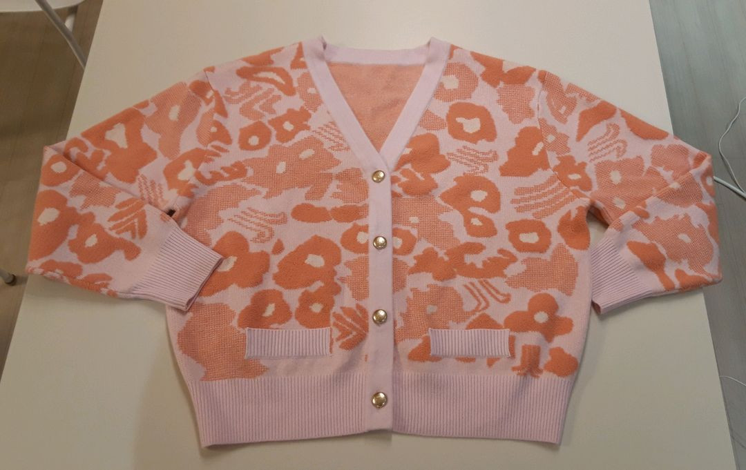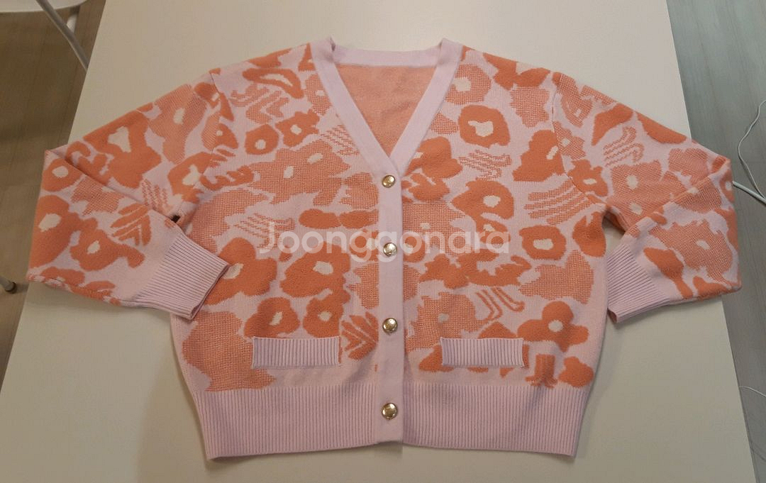 예쁜 핑크 베이스에 오렌지 플로럴 패턴이 들어간 가디건이에요. 새상품 골드 버튼 디테일이 고급스럽습니다. 득템하세요.