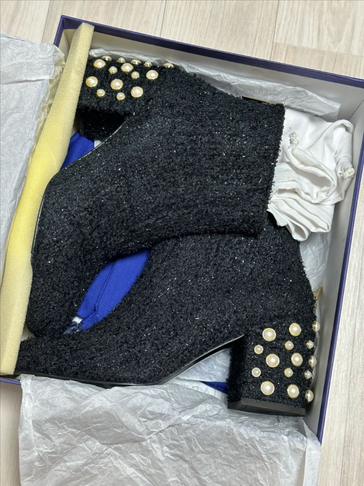 Stuart weitzman 앵클부츠 실내에서 시착만해본 새상품 트위드 재질 진주 펄 디테일 정가 $575 구매 사이즈 8.5 평소 구두 250 신는데 편하게 잘맞아요
