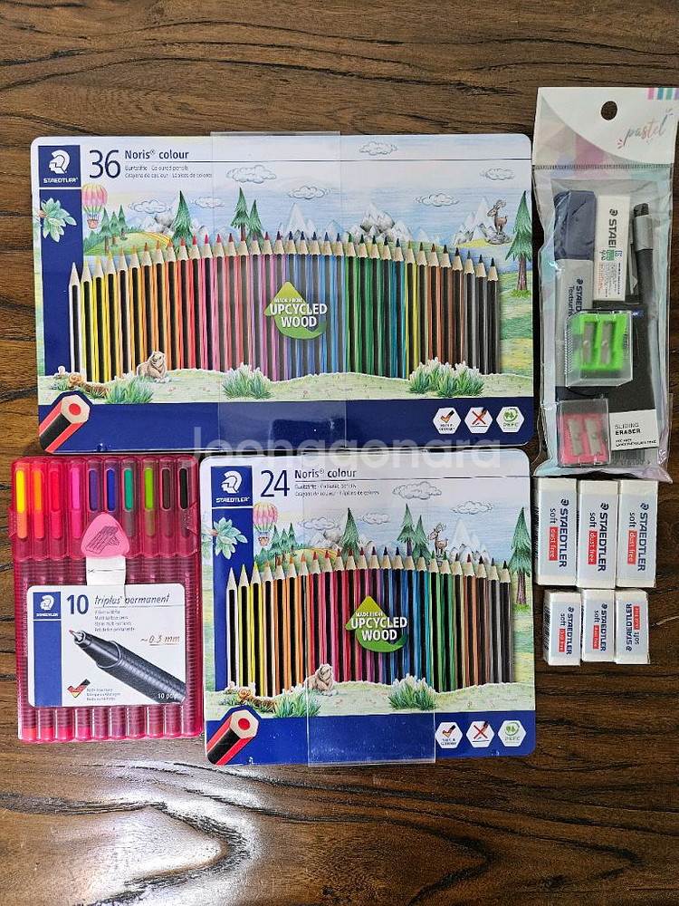 오전 8시전 구매자에게 배송비무료 미개봉 스테들러 색연필 세트 팝니다. 36색, 24색 색연필 모두 새 제품입니다. 제도 샤프 세트, 지우개, 노트북파우치도 같이 드려요. 노트북파우치는 5만원 상당의 제품입니다. 중고거래상 교환, 반품, 환불은 되지 않습니다. 신중한 구매선택부탁드립니다. 우체국택배로 발송해드립니다.