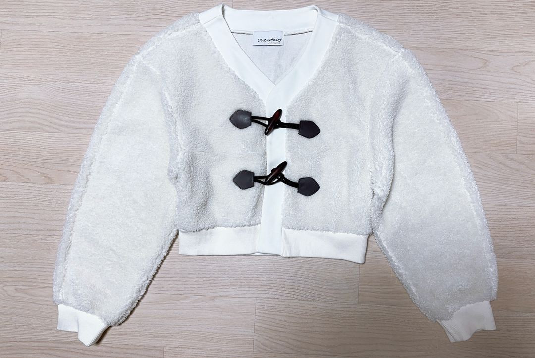 더플가디건 F 세미크롭기장이라 허리 강조돼서 날씬해보이고 뽀글이 소재라 귀여워운 디자인 택착 일반 3800 반값 1800