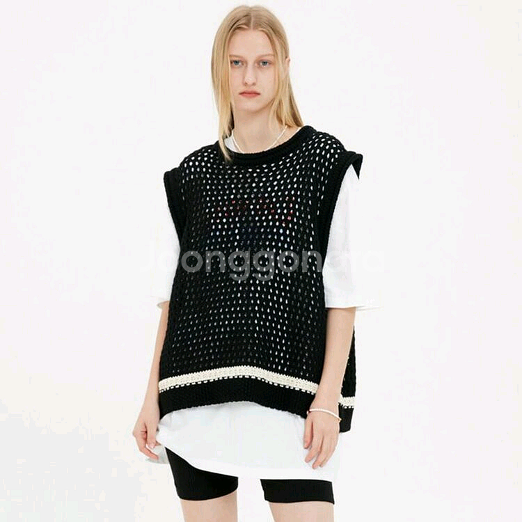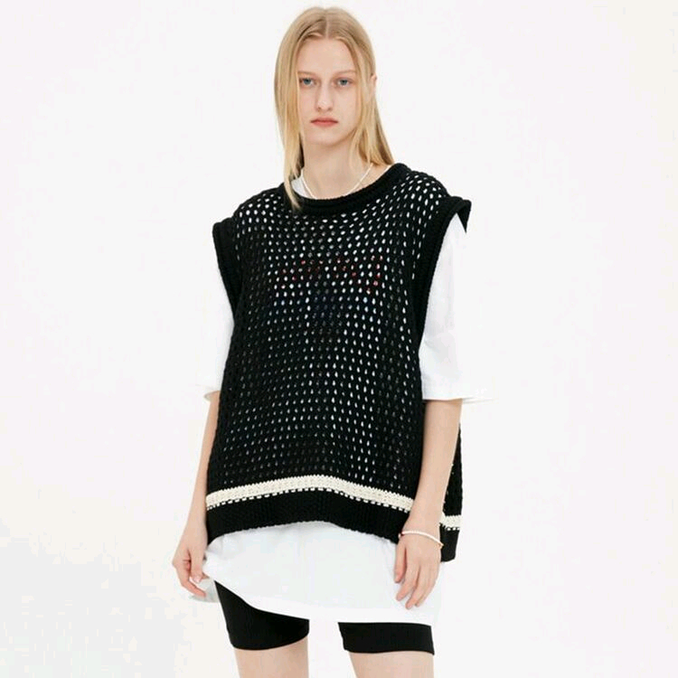 문선 블랙 크로셰 니트 베스트 / 여성 조끼 총길이 58 어깨길이 48 가슴단면 62 소재 Cotton 100 표기사이즈 One Size 독특하고 트렌디한 무드를 연출하는 MOONSUN(문선)의 블랙 크로셰 니트 베스트입니다. 전체적으로 성긴 짜임의 네트 디자인이 특징으로, 이너의 컬러나 패턴에 따라 다양한 분위기로 연출할 수 있습니다. 네크라인과 암홀은 튼튼하게 마감되어 있으며, 밑단에는 아이보리 또는 화이트 계열의 배색 라인이 들어가 있어 경쾌한 포인트를 줍니다. 가벼운 포인트 룩이나, 개성 있는 레이어드 스타일을 선호하는 분께 추천합니다. 0310