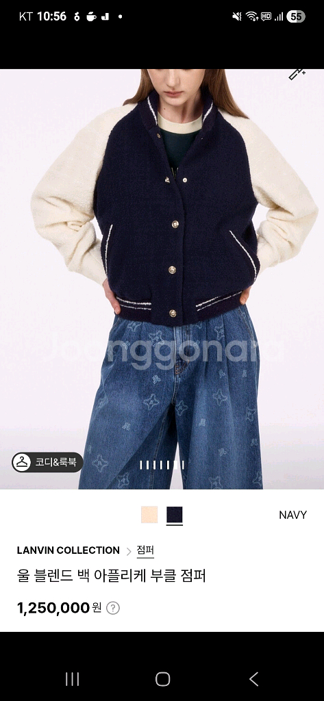 울 블렌드 소재의 고급스러운 백 아플리케 디테일이 포인트인 부클 점퍼예요. 네이비 컬러로 어떤 스타일링에도 잘 어울리고, 상태도 깔끔해 보입니다. 랑방 입음세련되구이뻐요 꼭하실분만요