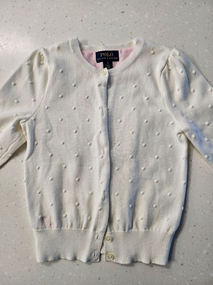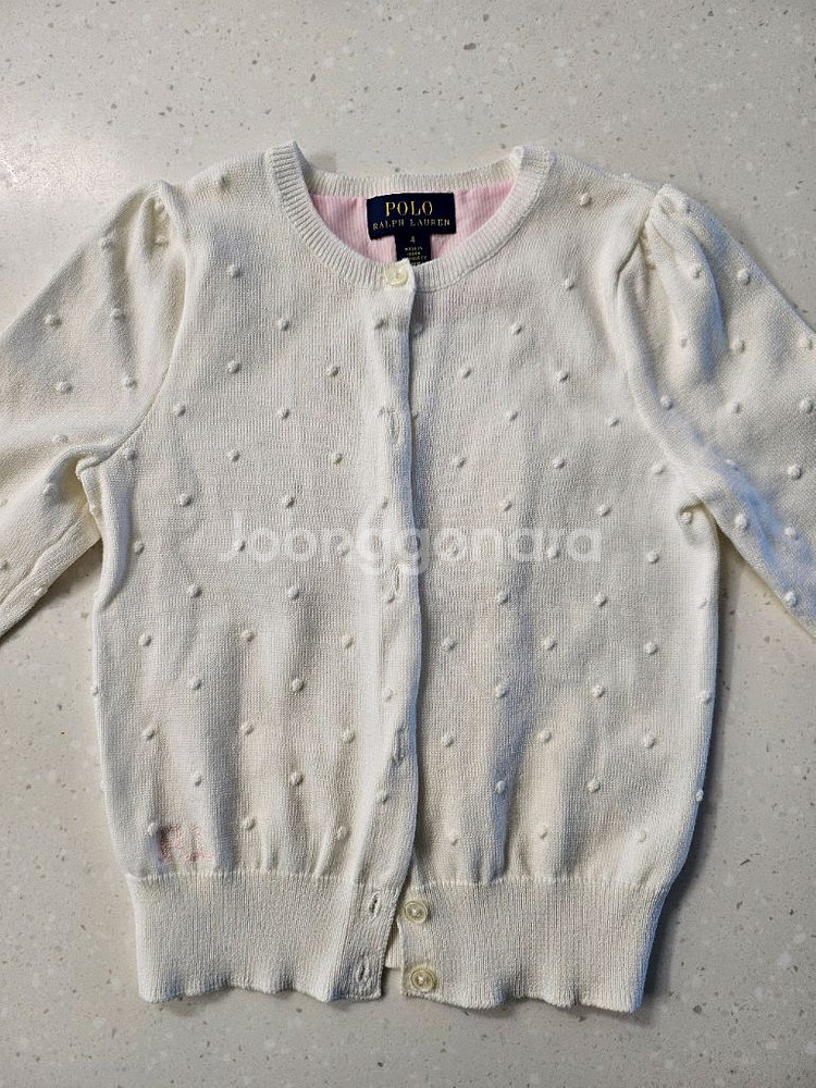 폴로 랄프로렌 여아용 니트 가디건이에요. 화이트 바탕에 핑크 포인트가 예쁘고 4T 사이즈로 아이가 예쁘게 입을 수 있을 것 같아요.